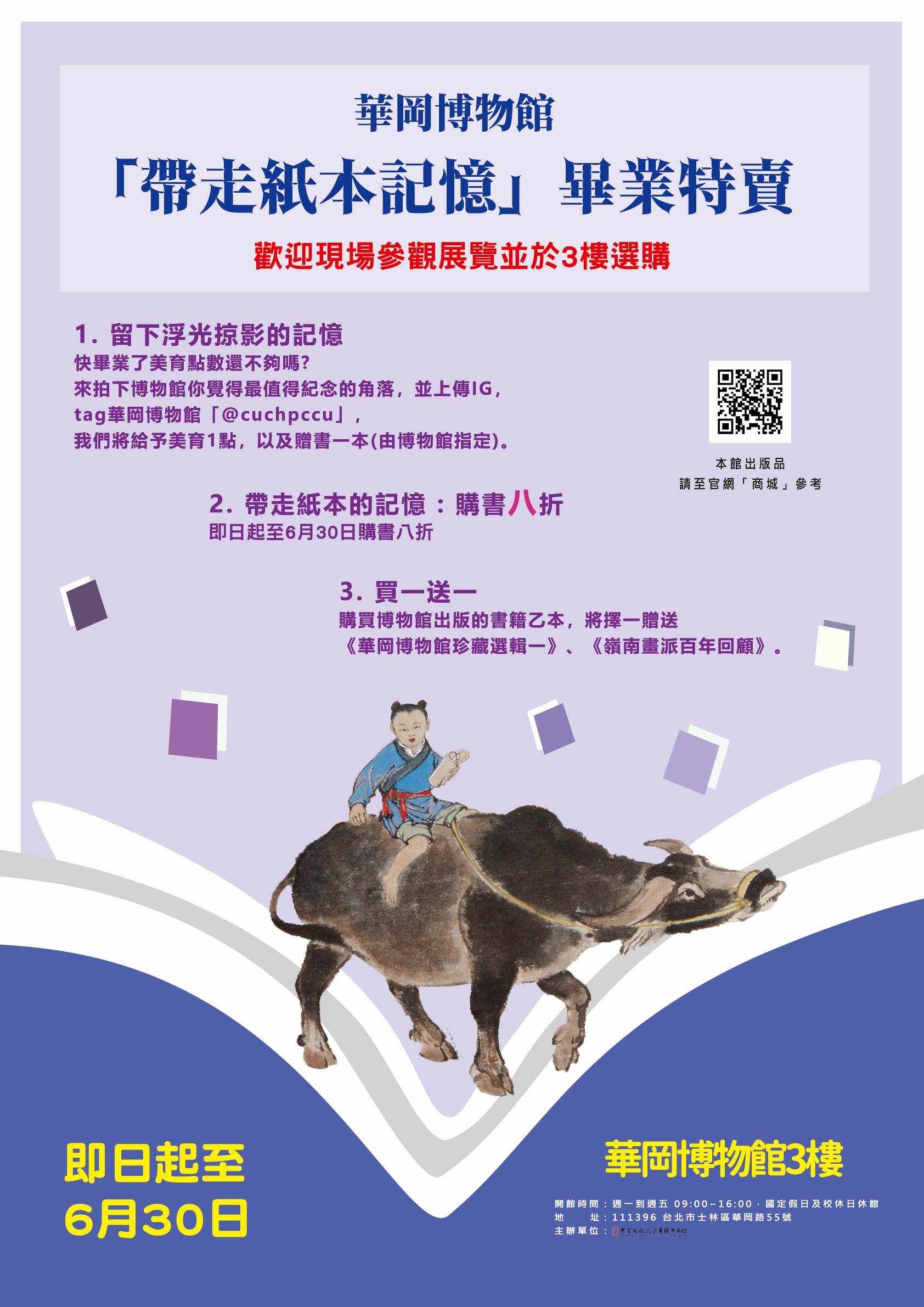 購買博物館出版的書籍乙本,將擇一贈送《華岡博物館珍藏選輯一》、《嶺南畫派百年回顧》。